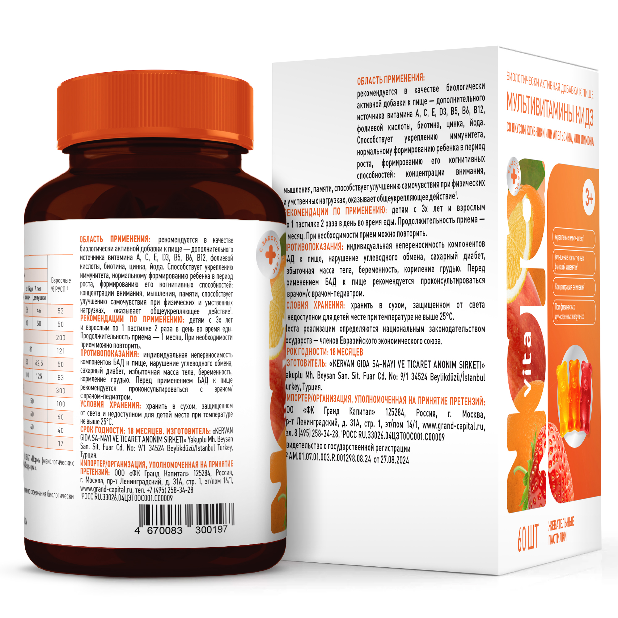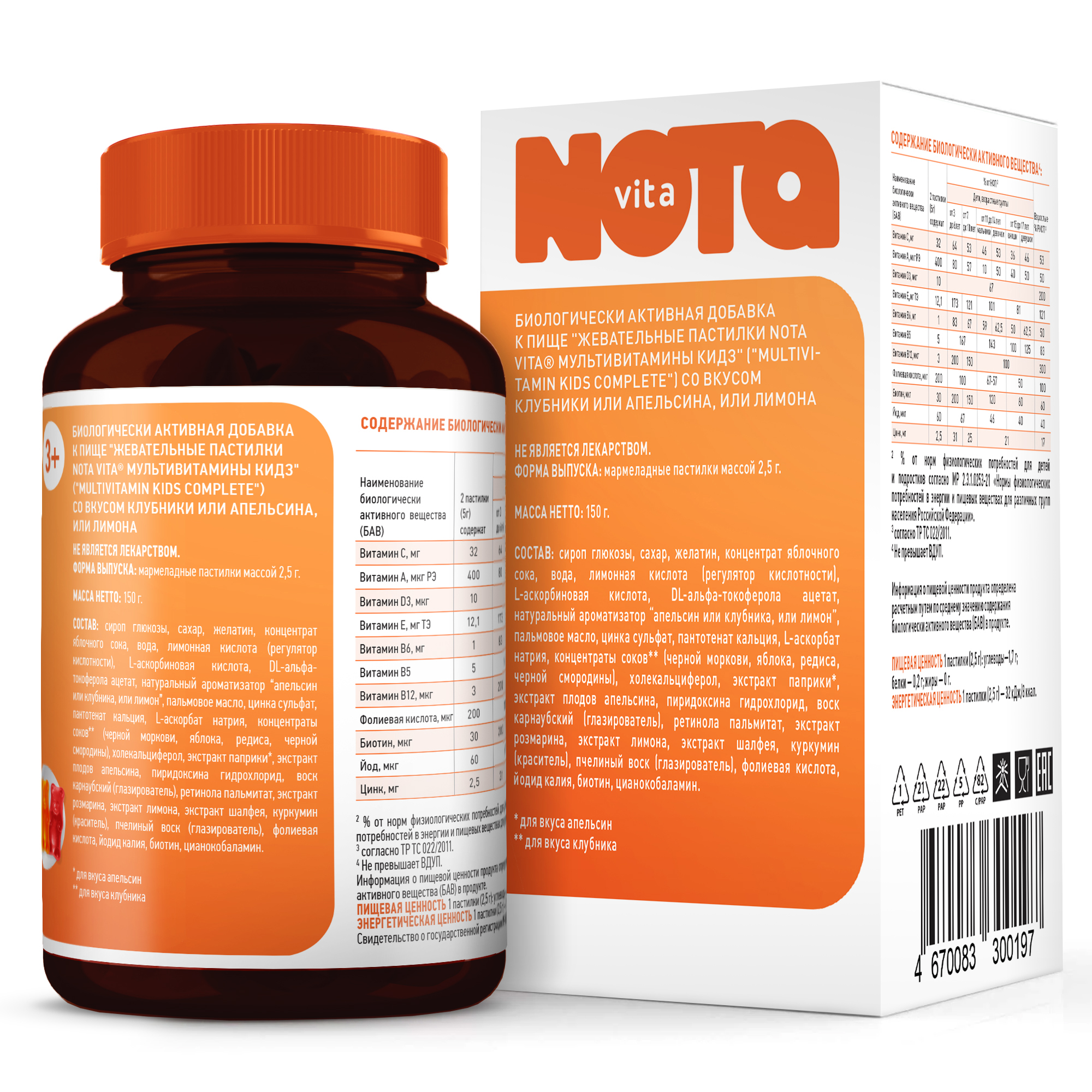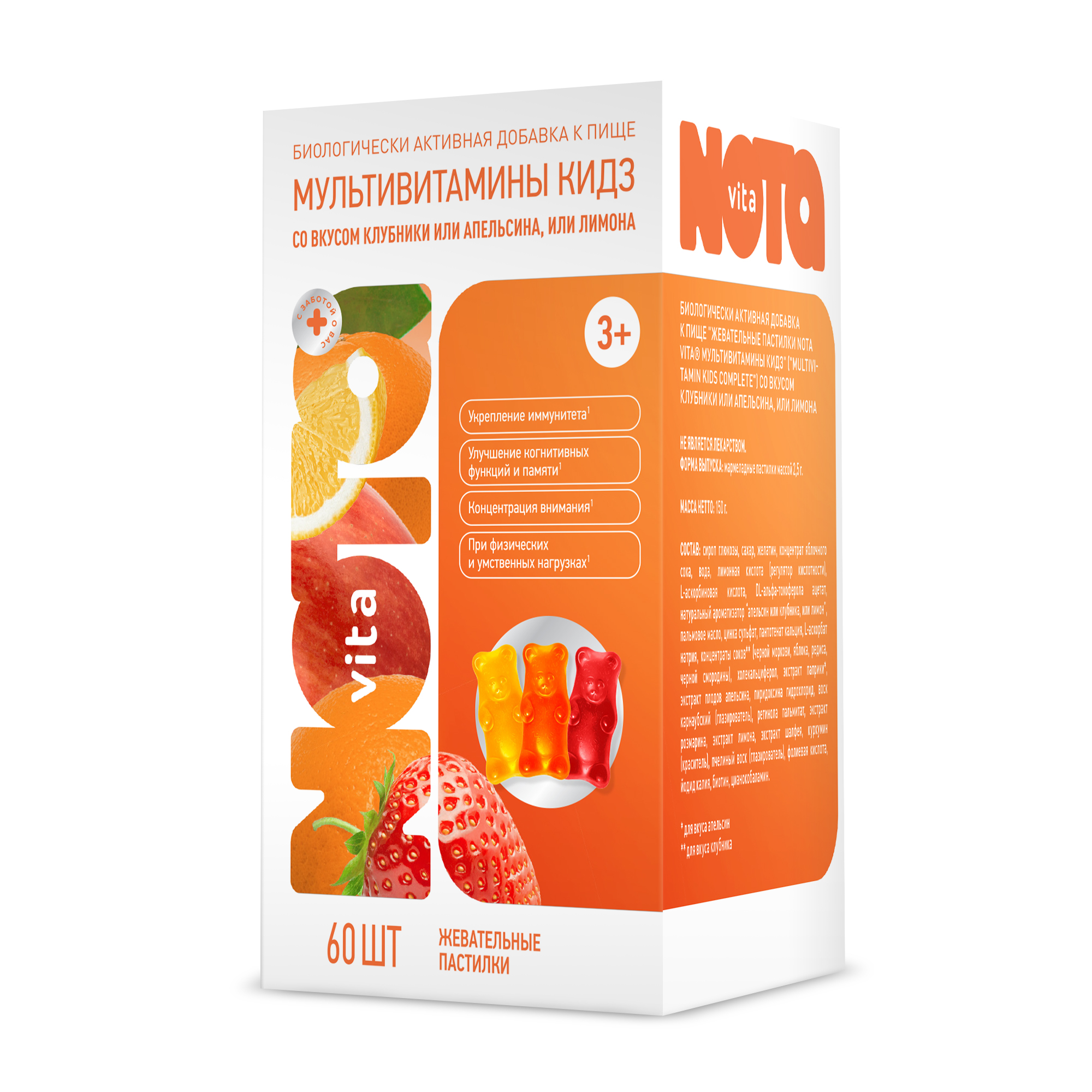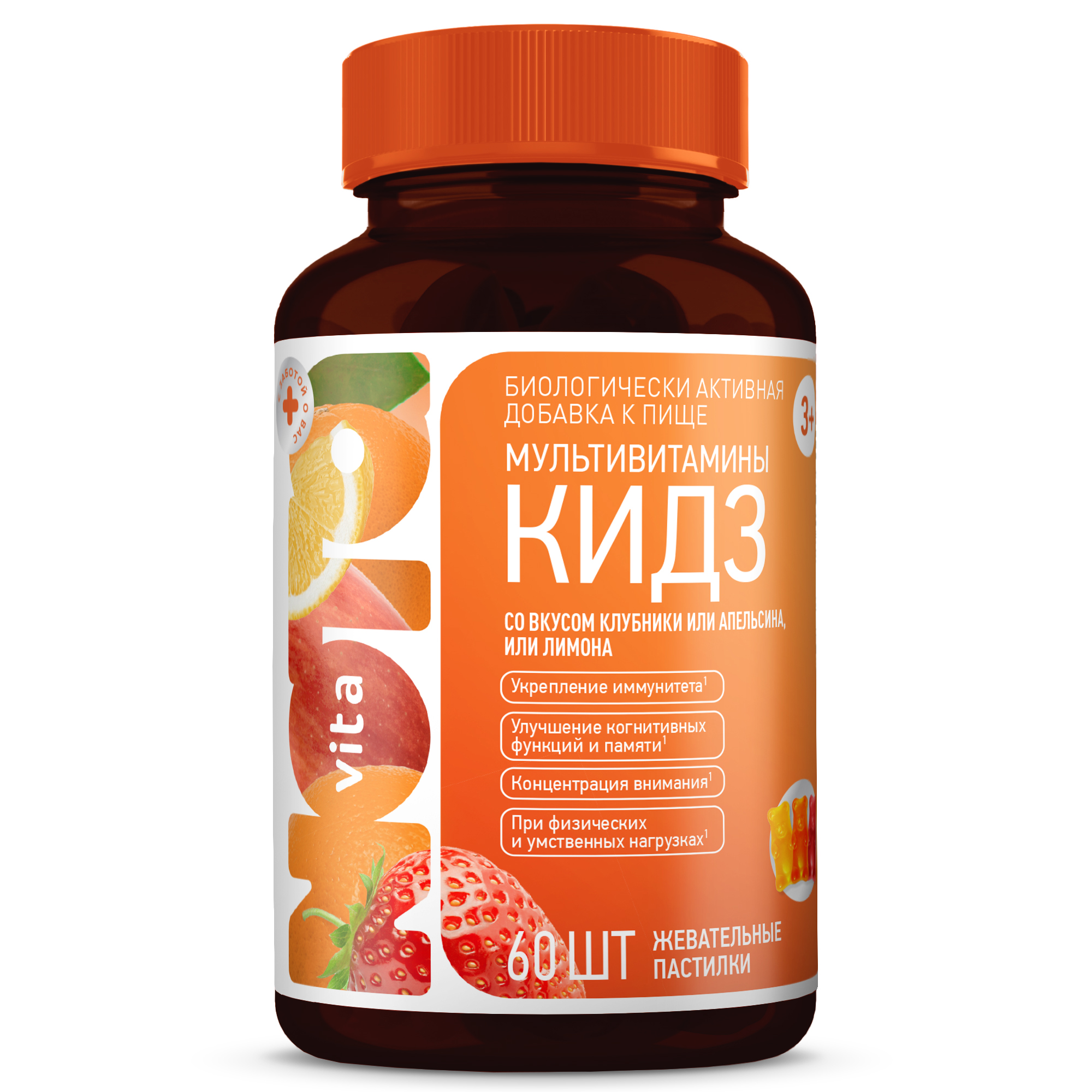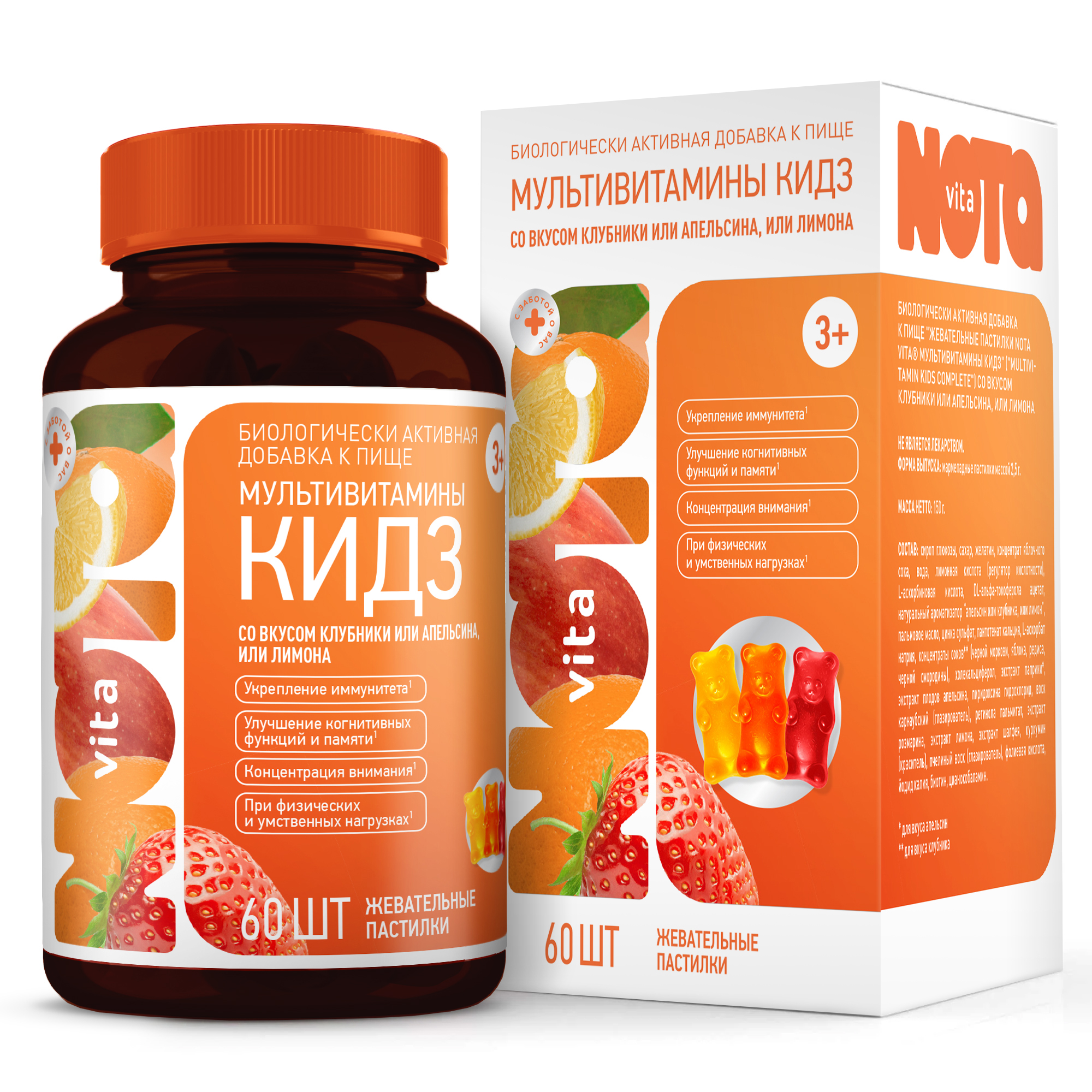 Мультивитамины кидз Nota Vita для детей жевательные пастилки со вкусом клубники или апельсина или лимона 60шт