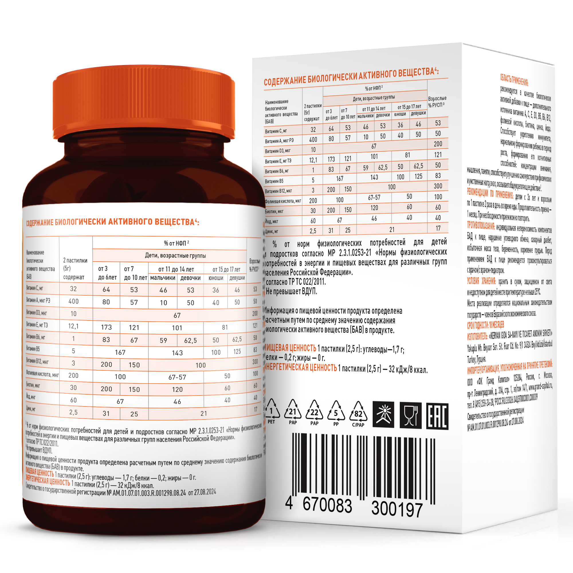 Сироп глюкозы, сахар, желатин, концентрат яблочного сока, вода, лимонная кислота (регулятор кислотности), L-аскорбиновая кислота, DL-альфа-токоферола ацетат, натуральный ароматизатор «апельсин или клубника или лимон», пальмовое масло, цинка сульфат, пантотенат кальция, L-аскорбат натрия, концентраты соков (черной моркови, яблока, редиса, черной смородины), холекальциферол, экстракт паприки, экстракт плодов апельсина, пиридоксина гидрохлорид, воск карнаубский (глазирователь), ретинола пальмитат, экстракт розмарина, экстракт лимона, экстракт шалфея, куркумин (краситель), пчелиный воск (глазирователь), фолиевая кислота, йодид калия, биотин, цианокобаламин.