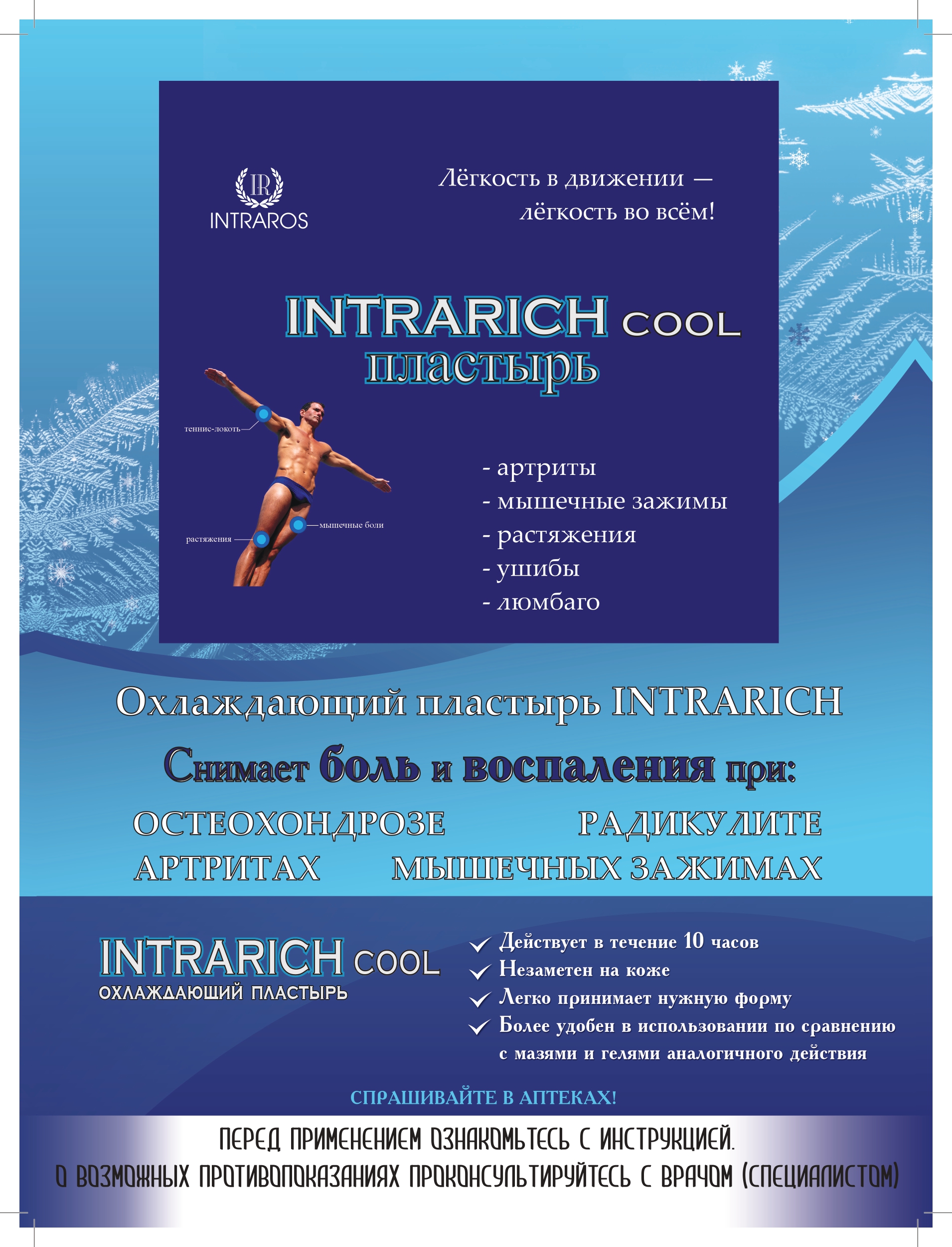 Пластырь INTRARICH COOL незаметен под одеждой, продолжительность его действия составляет 8-10 часов, обладает высокой воздухо- и влагопроницаемостью, эластичен, не сковывает движений.